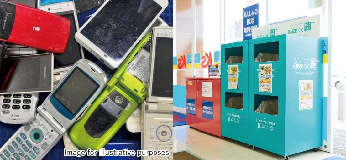 We collect used mobile phones—which contain large amounts of rare metals such as gold, silver, and copper—with the aim of effectively using resources. We also cooperate in the “Ecorica” initiative for recyclable used ink cartridges, which are collected from customers, cleaned, refilled with ink, and sold under the initiative. Ecorica collection boxes are installed at our stores for this purpose.