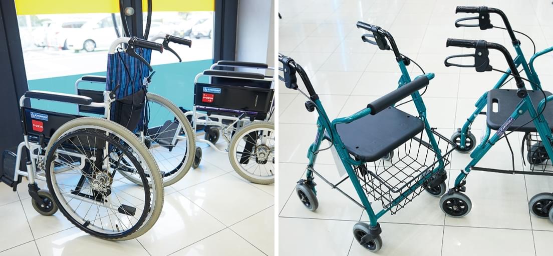 ケーズデンキの店舗は、入り口付近にどなたでもご利用できるように車椅子を設置しています。