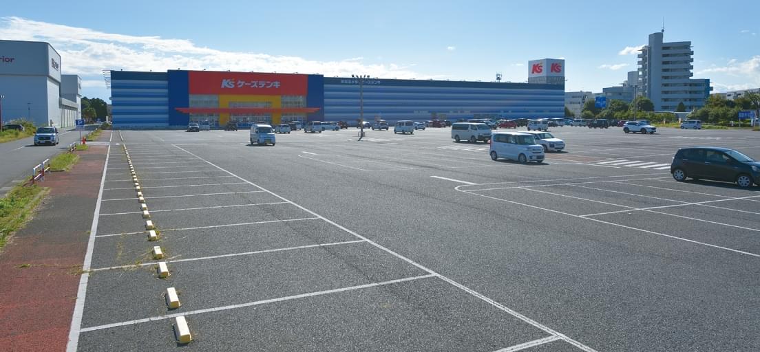 ケーズデンキは、郊外の幹線道路沿いに多く立地しています。そのため、多くのお客様がお車で来店されます。家電品をお車に積み込む場合にもドアが開け閉めしやすく、ゆとりをもって駐車できるよう、車と車の間隔はなるべく広くとるよう設計しています。ピロティ型の場合は雨も防ぐことができます。また、道路から店舗への入場もスムーズになるよう考えて設計しています。