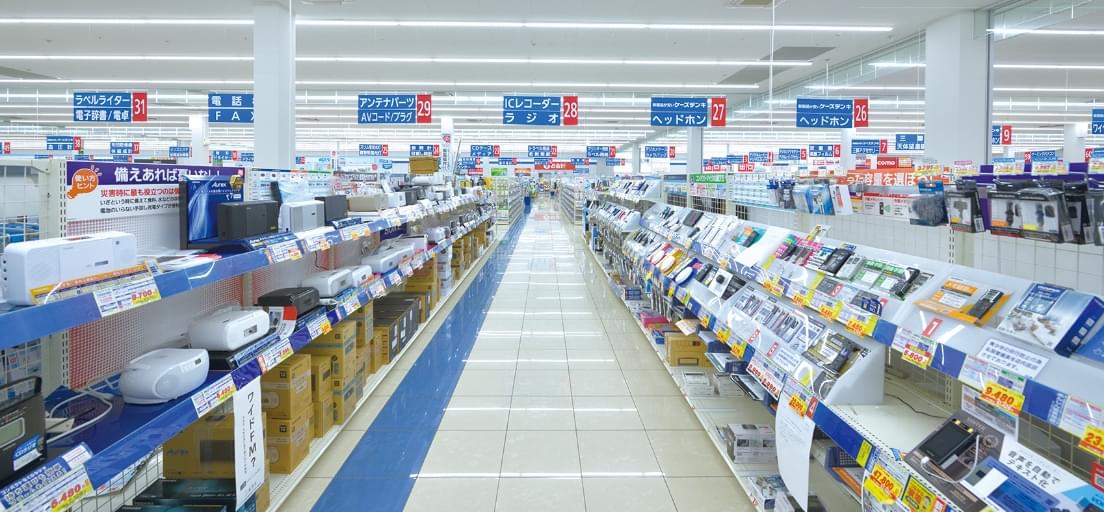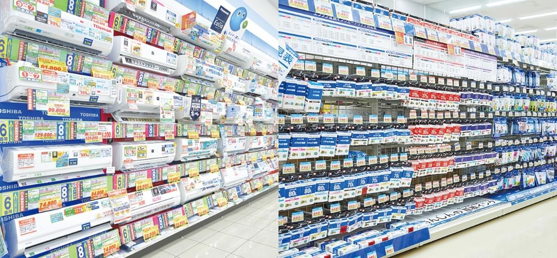 ケーズデンキは、家電専門店として家電に特化した品揃えをしています。店舗の規模によって違いますが、平均的な大きさの店舗でおよそ20,000 種類前後を揃えています。例えばプリンターのインクカートリッジなどの消耗品でも幅広い品揃えをしています。また、それぞれの地域の特色に合わせて臨機応変に在庫数や商品ラインアップを変更しています。