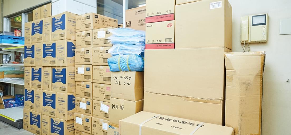 ケーズデンキの店舗では、東日本大震災の経験から、水や食料など万が一のための災害用品の備蓄を行っています。